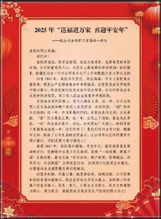 為進(jìn)一步夯實企業(yè)安全文化根基,提升職工安全素養(yǎng),充分調(diào)動職工家屬參與安全管理的積極性、主動性和創(chuàng)造性,凝聚“企業(yè)抓安全、家庭助安全、職工保安全”的強(qiáng)大合力,為公司持續(xù)安全穩(wěn)定發(fā)展提供有力支撐,在2025年新春佳節(jié)即將來臨之際,公司工會開展了2025年“送福進(jìn)萬家 喜迎平安年”——致職工家屬一封信活動。