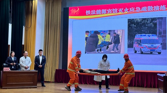與會人員共同觀看了消防安全視頻宣傳片和公司賓館以情景劇模式開展的突發(fā)火災事故應急疏散演練。