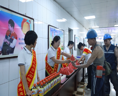為讓職工感受高溫暑季的清涼,連日來,曉南礦工會在副井口開展防暑降溫慰問活動。每天,該礦工會工作人員、女工協(xié)管員和志愿者早早備好冰鎮(zhèn)西瓜、冰紅茶、雪糕等解暑降溫品,在副井口為升入井的職工第一時間遞上清涼飲品。圖為該礦“紅綬帶”巾幗服務(wù)隊在為升入井職工送清涼。 袁進(jìn)成 攝