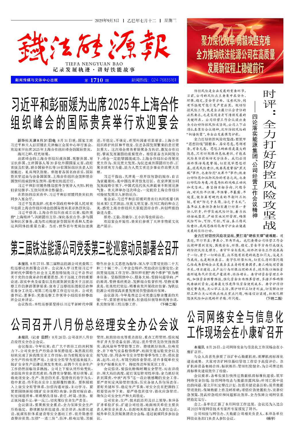 全力打好防控風(fēng)險攻堅戰(zhàn),要打造“硬核支撐”破難題。道雖邇,不行不至;事雖小,不為不成。我們要將公司經(jīng)營工作會議精神落到實處,圍繞安全、環(huán)保、穩(wěn)定、資金等方面形成強大的防控風(fēng)險支撐力。要守牢安全底線,始終把安全工作放在高于一切、重于一切的位置,決不能有絲毫的疏忽和閃失,這是工作底線,也是剛性要求。要守住環(huán)保紅線,切實認清環(huán)保問題已經(jīng)成為影響企業(yè)發(fā)展甚至生存的重要因素,要正確處理資源開采、項目建設(shè)、生產(chǎn)運行與環(huán)保治理的關(guān)系,絕不能以犧牲資源環(huán)境為代價實現(xiàn)產(chǎn)量提升、經(jīng)濟增長。要守好資金管理生命線,加強資金預(yù)警預(yù)報,強化資金全面預(yù)算管理,多措并舉確保既要融到資金,還要最大限度降低資金使用成本。要守護信訪穩(wěn)定警戒線,關(guān)心職工生活、保護好職工切身利益,切實解決好職工群眾關(guān)心的熱點難點重點問題,暢通信訪渠道,積極化解隱性風(fēng)險和出現(xiàn)的新矛盾、新問題。 (下轉(zhuǎn)二版)