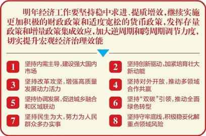 會議強調(diào),做好明年經(jīng)濟工作,要以習(xí)近平新時代中國特色社會主義思想為指導(dǎo),深入貫徹黨的二十大和二十屆歷次全會精神,完整準確全面貫徹新發(fā)展理念,加快構(gòu)建新發(fā)展格局,著力推動高質(zhì)量發(fā)展,堅持穩(wěn)中求進工作總基調(diào),更好統(tǒng)籌國內(nèi)經(jīng)濟工作和國際經(jīng)貿(mào)斗爭,更好統(tǒng)籌發(fā)展和安全,實施更加積極有為的宏觀政策,增強政策前瞻性針對性協(xié)同性,持續(xù)擴大內(nèi)需、優(yōu)化供給,做優(yōu)增量、盤活存量,因地制宜發(fā)展新質(zhì)生產(chǎn)力,縱深推進全國統(tǒng)一大市場建設(shè),持續(xù)防范化解重點領(lǐng)域風(fēng)險,著力穩(wěn)就業(yè)、穩(wěn)企業(yè)、穩(wěn)市場、穩(wěn)預(yù)期,推動經(jīng)濟實現(xiàn)質(zhì)的有效提升和量的合理增長,保持社會和諧穩(wěn)定,實現(xiàn)“十五五”良好開局。